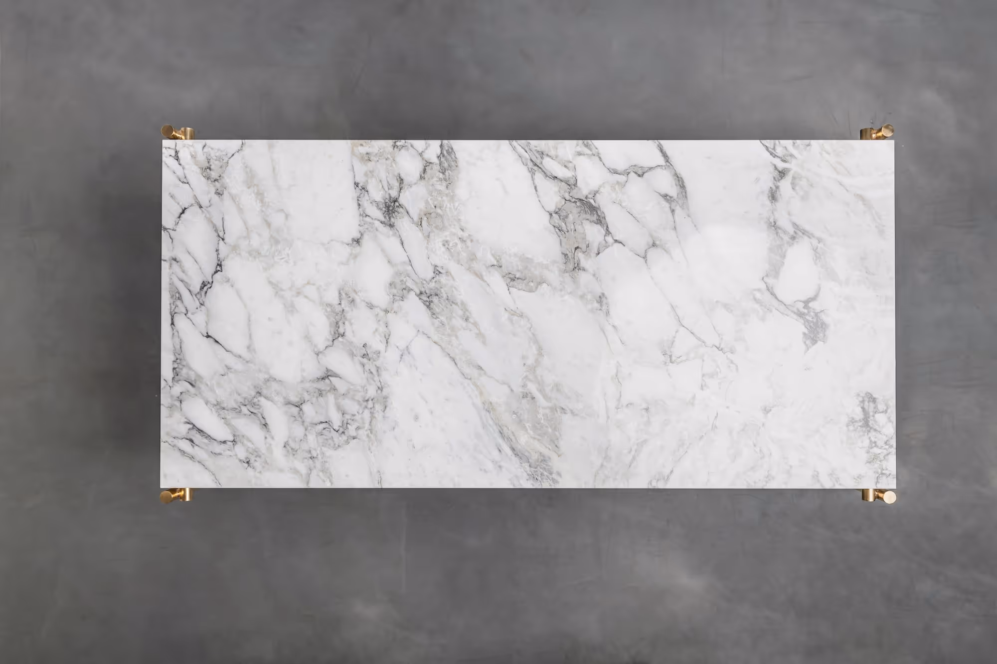 Freddie został zbudowany z materiałów, które same w sobie przykuwają uwagę. Marmur o polerowanej, gładkiej powierzchni zestawiliśmy z delikatnie szczotkowanym mosiądzem.