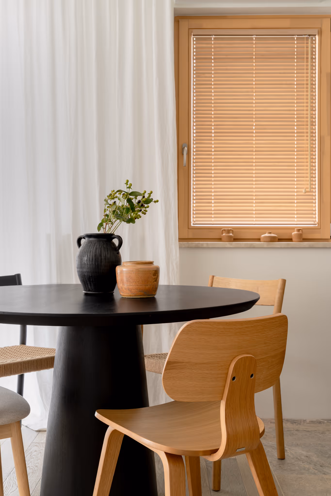 Ten okrągły stół jest zbudowany z prostych elementów, które dobrze ze sobą współgrają. Podcięty blat równoważy podstawę, a głęboki odcień czerni wprowadzi do jadalni subtelny kontrast i nutę tajemniczości, która nadaje przestrzeni charakter.