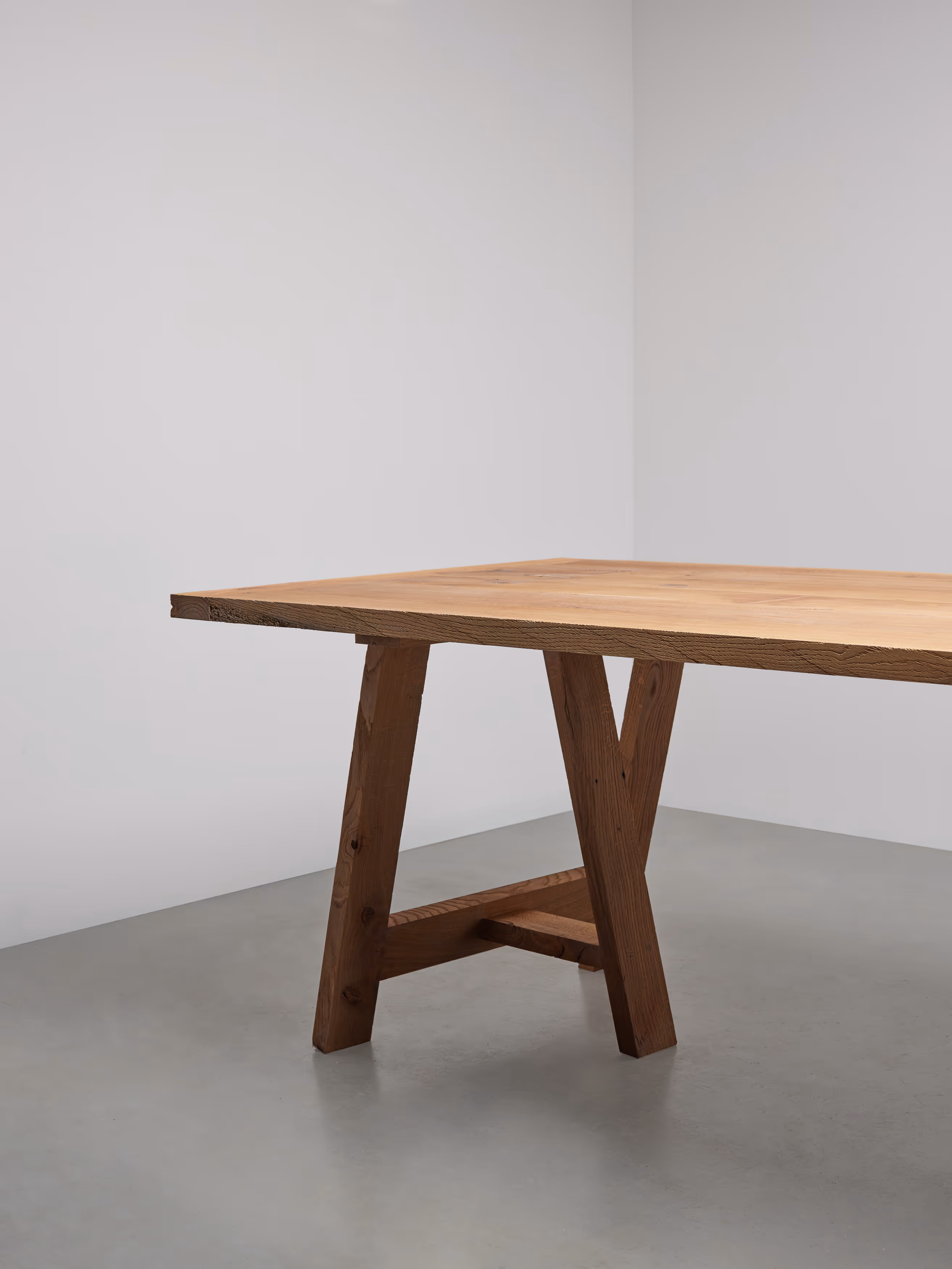 W konstrukcji tego rustykalnego stołu prostota broni się sama. Gruby, masywny blat spoczywa na solidnej podstawie, podkreślając jego surowy charakter. Szczotkowana powierzchnia pozostaje niejednorodna, z widocznymi śladami obróbki, które nadają mu szczerości i prawdy.