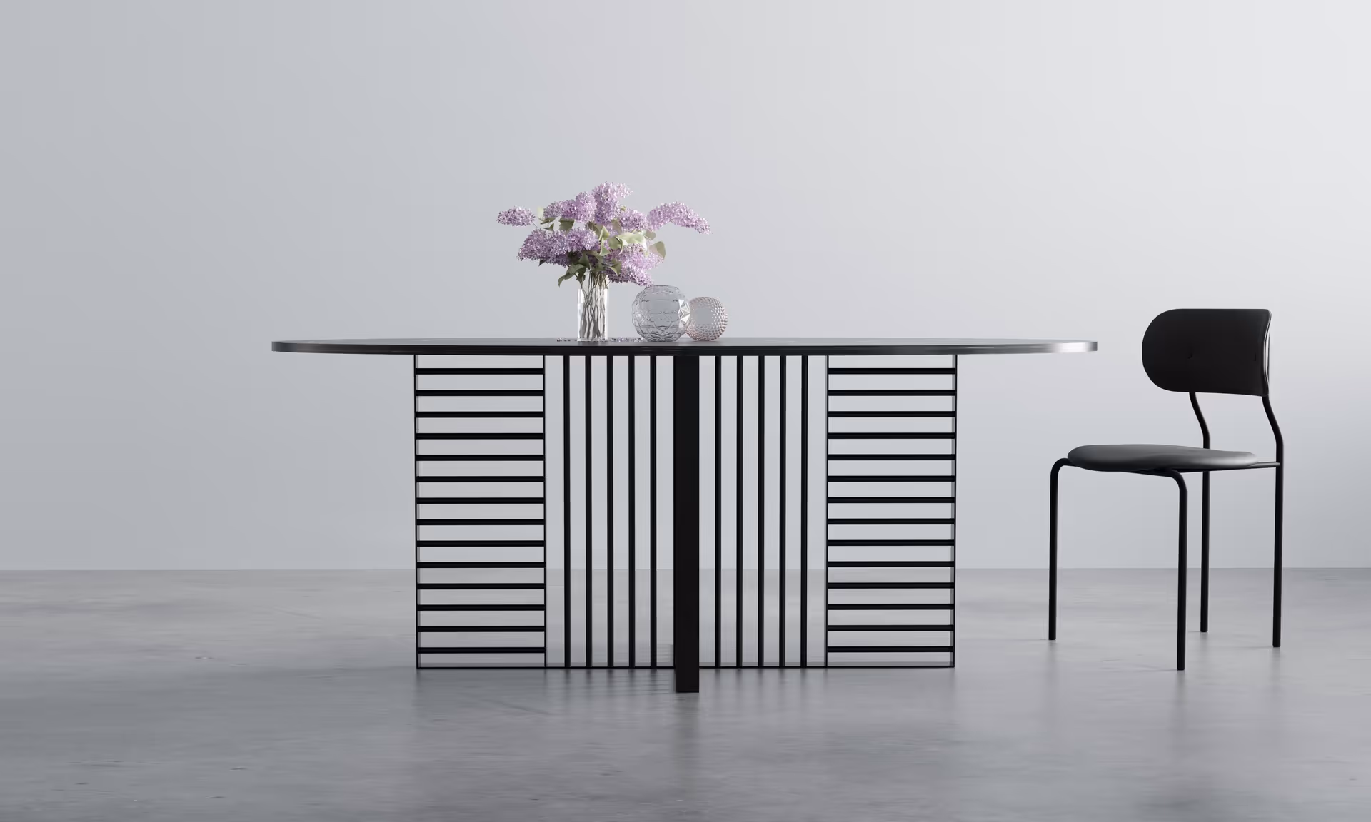 Polerowany marmur kontrastuje ze stalą o matowym wykończeniu, tworząc projekt oparty na zestawieniu faktur i światła. To forma, w której liczy się każdy detal - od grubości blatu po prześwity między prętami. Efekt pozostaje czytelny i zdecydowany.